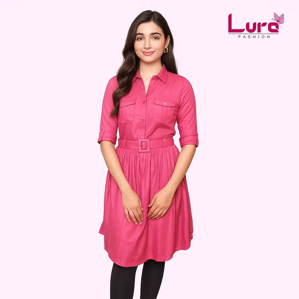 Stylish Cotton Knee-Length Dress with Adjustable Hip Belt – Elbow Sleeve, Collared, Zip Closure