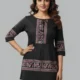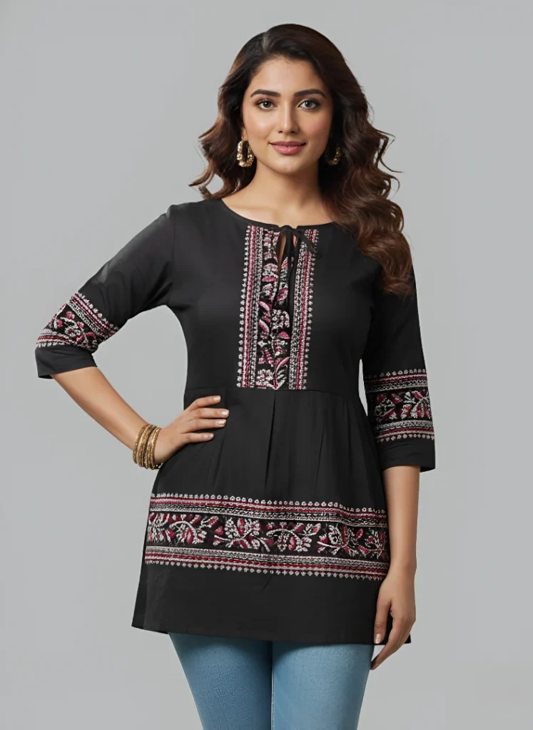 Stylish Printed Cotton Short Kurti for Women – 3/4 Sleeves, Round Neck with Front Knot Tie